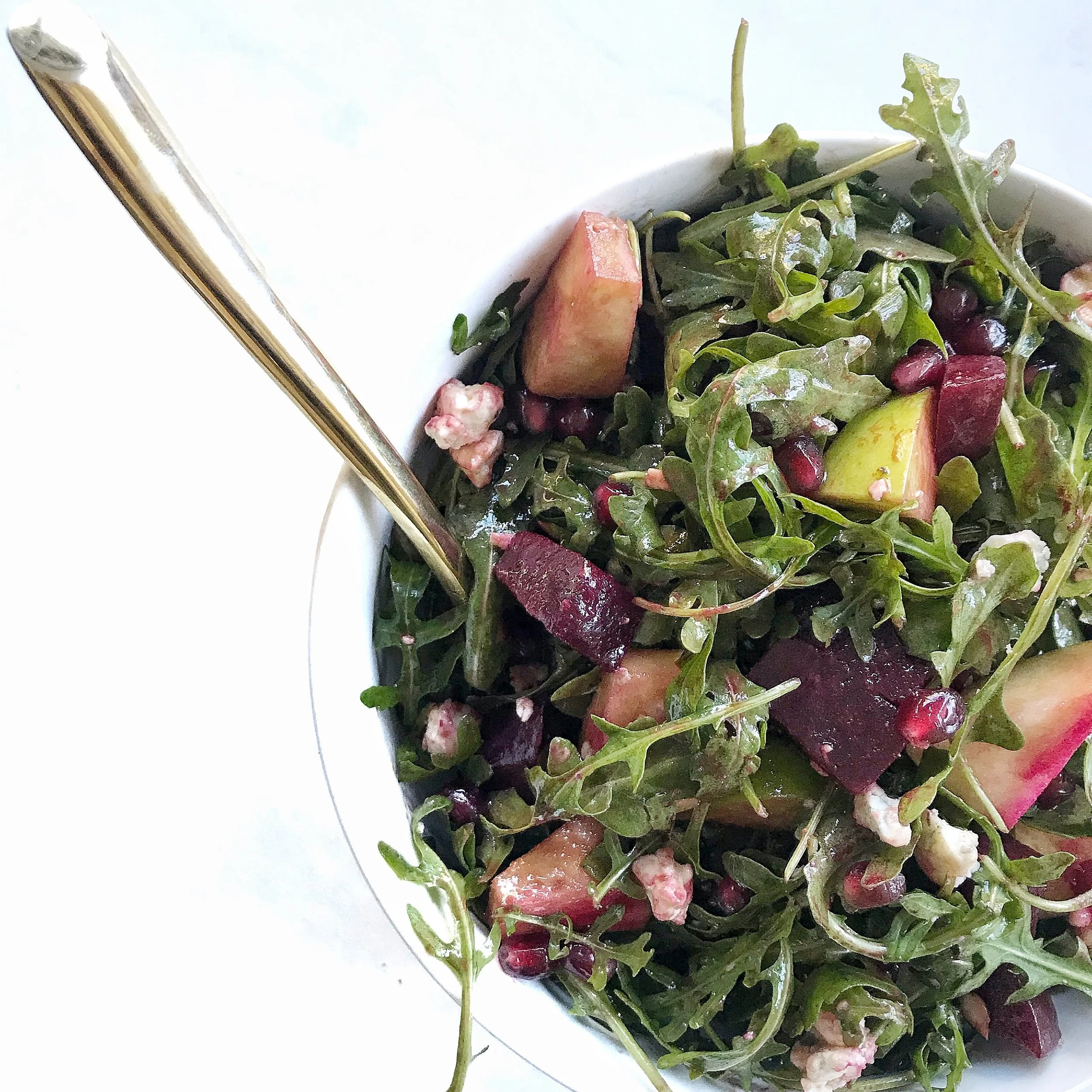 Combine the arugula, apple chunks, pomegranate, blue cheese, beets. Pour dressing over the salad and stir to evenly coat.